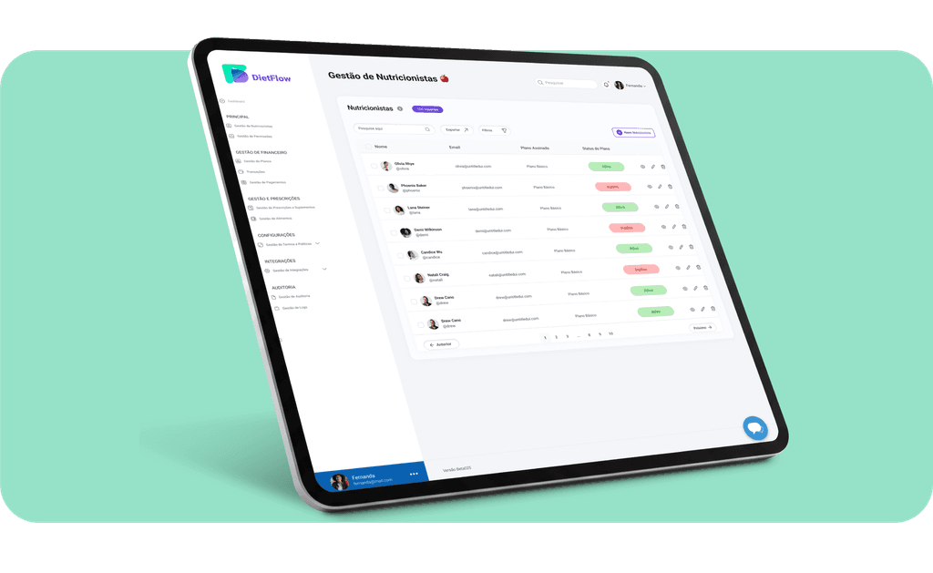 A interface foi redesenhada pensando na facilidade de uso e na organização de dados, permitindo acompanhar indicadores financeiros, desempenho e engajamento de forma clara e rápida. Cada nutricionista tem seu perfil individual, mas a administração consegue visualizar e gerenciar toda a rede de profissionais, garantindo transparência, eficiência e escalabilidade.