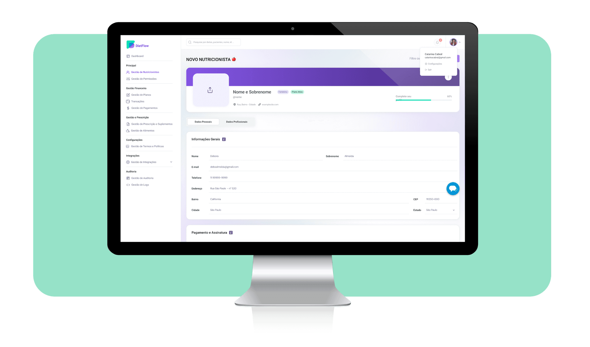 O redesign do DietFlow foi elaborado para otimizar a gestão de múltiplos nutricionistas dentro de uma mesma plataforma. O sistema oferece aos administradores amplo controle sobre contas cadastradas, planos de assinatura, prescrições, suplementos e auditorias, tudo em um ambiente centralizado e intuitivo.